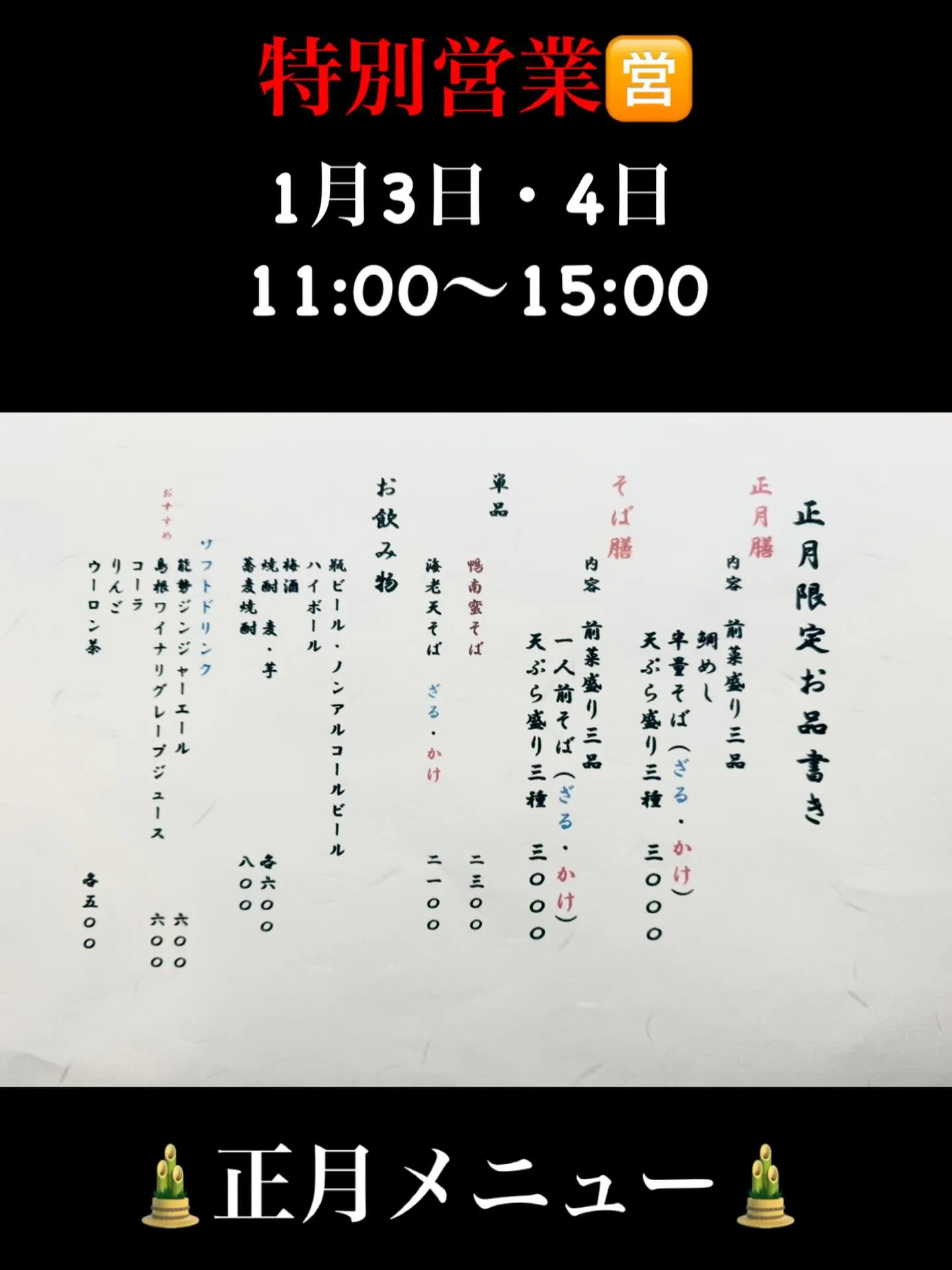 🈺🎍特別営業🎍🈺 2026/04/27 🈺🎍特別営業🎍🈺 1月3日,4日 OPEN:11時〜15時(L.O14時半) 特別メニュー:正月膳 3,000円 鯛めし🐟は一年でこの2日間のみの販売でございますので是非ご来店ください☺︎ 🪑ご予約なしでもご来店可能です☺︎※特別メニューはなくなり次第終了となりますのでご了承ください。 🅿️店舗前に駐車場ございます。