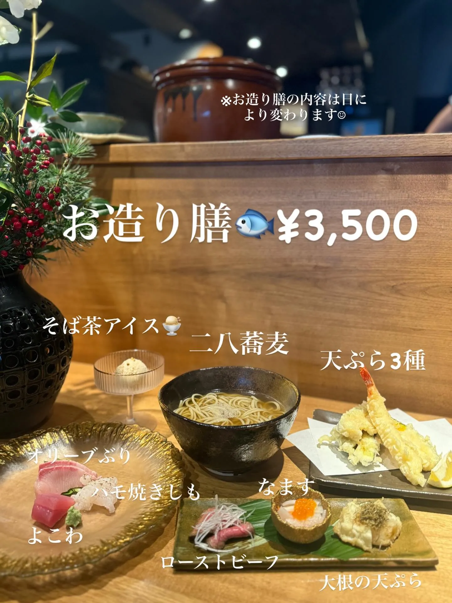 お造り膳(¥3,500 ) 2026/04/27 お造り膳(¥3,500 ) 前菜/お造り盛り/天ぷら3種/二八蕎麦/デザート ※内容は日により変わります。 昼の部のみ、要予約でございます。ご予約日の前日までにご連絡ください☺︎ ご予約はインスタDM.LINE.tell:070-4811-4744まで
