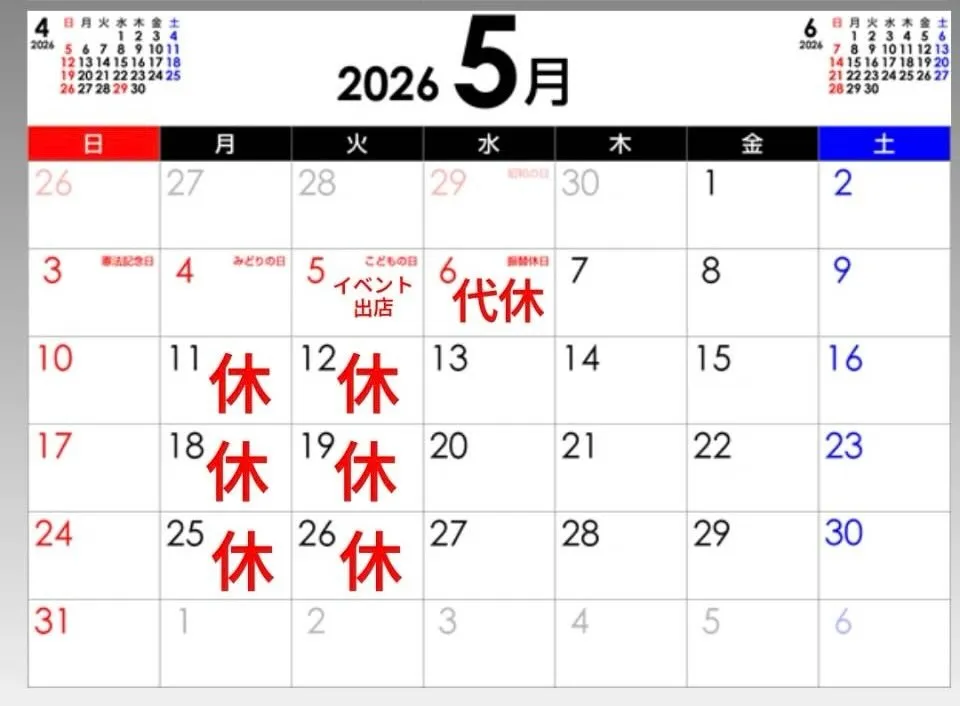 5月営業日のお知らせ📢です☺︎ 2026/04/27 5月営業日のお知らせ📢です☺︎ 5月5日は延命寺さんでイベント出店 5月6日はお休みの予定です。 GW中もご予約承っております☺︎ ※5名様〜はお席に限りがございますのでご予約大歓迎です!
